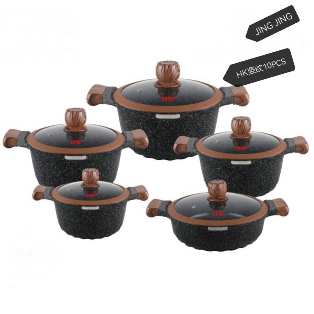 Upgrade your cooking experience with the 10-Piece Granite Cookware Set, designed for modern Cameroonian kitchens. Made from durable die-cast aluminum and finished with a non-stick ceramic coating, this set ensures even heat distribution, effortless cooking, and easy cleaning. Compatible with gas and induction cookers, it offers versatile cooking options for everyday meals or special family dinners. Its stylish granite finish and ergonomic design make it both functional and elegant.