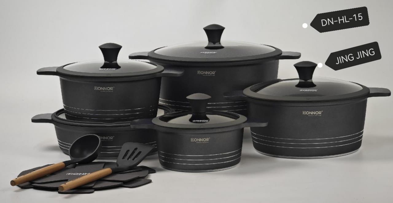 Elevate your cooking experience with the Donnor DN-HL-15 15-Piece Cookware Set, designed for modern Cameroonian kitchens. Crafted from die-cast aluminum with a non-stick coating, this set ensures even heat distribution, healthy low-oil cooking, and effortless cleaning. The 15-piece set includes various pots, pans, and lids — everything you need to prepare delicious family meals with ease. Its stylish and durable design makes it a perfect addition to any kitchen.