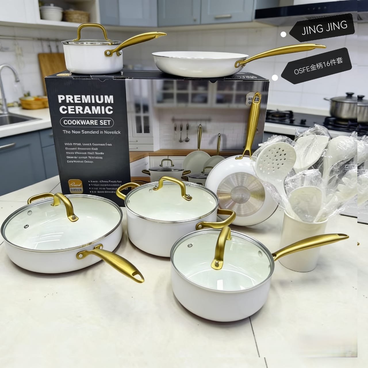 Transform your kitchen with the VONIKI 16-Piece Ceramic Cookware Set, designed for stylish and health-conscious Cameroonian homes. This elegant white and gold cookware set comes complete with pots, pans, and cooking utensils, giving you everything you need for everyday cooking and special family meals.